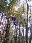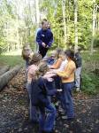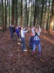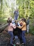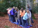 Dabei lernten sie auf spielerische Weise in dreifacher Hinsicht: Ein Teil der Aufgaben diente zur Verbesserung der Teamfähigkeit; so standen die Schüler z.B. auf einem Stück Plane, die sie einmal komplett herumdrehen mussten, ohne dass einer die Plane verlässt. Hier benötigten sie Strategien, Ideen und v.a. Zusammenarbeit. Als zweiter Aspekt wurde der Punkt Vertrauen behandelt. Die Schüler machten Übungen, bei denen sie sich aufeinander verlassen können mussten wie z.B. beim „Todessturz“, bei dem ein Kind sich von einem hohen Baumstamm fallen ließ und von dem Rest der Gruppe sicher mit den Händen aufgefangen wurde. Hier wurde auch bereits der dritte Teilbereich mit einbezogen: seine Grenzen kennenlernen und zu erweitern. So gehörte nicht nur zum Fallenlassen Mut, sondern auch zur Bewältigung der Riesenschaukel. Hierfür hatten Koj und Albers zwischen zwei Bäumen eine Schaukel aus Kletterseilen konstruiert. Ein Kind nach dem Anderen wurde mit ausreichender und fachgerechter Sicherung von der Gruppe soweit hochgezogen wie es sich zutraute, um dann das Zugseil loszulassen und mit großem Schwung horizontal über den Waldboden zu schaukeln.
