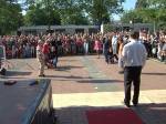 Und die Meute hatte auch noch Spaß daran: Schülerinnen und Schüler, besonders aus den jüngeren Jahrgangsstufen, amüsierten sich köstlich, wenn einer Lehrperson ein Missgeschick passierte und forderten lauthals Zugaben. Ob sie je in einen normalen Schulalltag zurückfinden? „Das ist prima hier! So müsste Schule immer sein!“ äußerte sich eine Schülerin aus einer 5er Klasse. Wusste sie, was sie sagte?