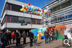 Einen Dachstuhl im herkömmlichen Sinne hat der Neubau unserer naturwissenschaftlichen Räumlichkeiten nicht. Das Richtfest, mit dem üblicherweise die Fertigstellung eines Rohbaus begangen wird, gab es aber heute, am 2. März 2011, dennoch. Tradition muss sein - mögen die neuen NW-Räume noch so modern werden. Und es ist eine schöne wie auch gute Tradition, mit dieser Zeremonie den zukünftigen Nutzern des neuen Gebäudes Alles Gute zu wünschen.