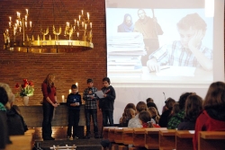 Eher untypisch begann der Gottesdienst: Alexander Linke wurde ein Ständchen gebracht, denn der Pastoralreferent hatte Geburtstag. Im Anschluß nahm der Gottesdienst den Verlauf, den die Schülerinnen und Schüler verschiedener Religionsgruppen beider Konfessionen geplant hatten. Themen wie Massentierhaltung, Konsum und Armut, Stress in der Schule sowie die Rolle des Internets rückten in den Blick dieses vorweihnachtlichen Gottesdienstes. Und so waren es die Figuren Josef und Maria, die sich als Leitmotiv der projizierten Abbildungen in verschiedenen Situationen wiederfanden, etwa in einem überfüllten Geflügelstall oder im Supermarkt.