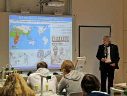 Dabei ist zu beachten, so erklärte Herr Prof. Dr. Schäbitz, dass diese Wanderung des modernen Menschen nicht die erste gewesen sei. Schon deutlich früher seien Vertreter der Gattung Homo erectus ausgewandert. Aus ihnen sei dann höchstwahrscheinlich der bekannte Neandertaler entstanden, auf den auch der moderne Mensch vor 35.000 Jahren bei seiner Wanderung nach Europa traf. Durch die Vermischung der Gene des modernen Menschen und des Neandertalers sei es dazu gekommen, dass jeder heutige Mensch immer noch ca. 5 % Neandertaler Erbgut in sich trage, auch wenn der Neandertaler kurz nach der Begegnung mit dem modernen Menschen ausstarb.