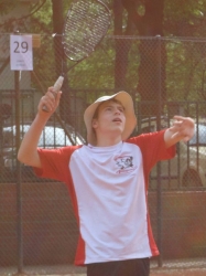 Da das Turnier von den Einzeln in den verschiedenen Kategorien- diese sind nach Alter und Geschlecht getrennt- eröffnet wird, nimmt in jedem der 12,8 Meter auseinander liegenden Felder ein Spieler Aufstellung. Ich bin erst beim zweiten Spiel im Einsatz, kann daher zwei meiner vier Gruppenkonkurrenten in Augenschein nehmen. Da es eine Weltmeisterschaft ist, kommen die Gegner nicht nur aus Deutschland, sondern in meinem Fall auch aus Schweden, der Slowakei und Ungarn. Es ist schwierig, dem Spiel der beiden Spieler zu folgen, die versuchen, sich die Bälle gegenseitig ins Feld zu schmettern, bzw. die flach über den Boden jagenden Schläge wieder ins gegnerische Feld zu kontern. Doch man muss dennoch aufpassen, denn der Verlierer der Vorpartie muss im folgenden Spiel den Part des Schiedsrichters übernehmen, welcher die volle Aufmerksamkeit in Anspruch nimmt. Es ist nicht immer einfach, zu erkennen, ob der Ball noch die gelbe Umrundung des Feldes touchiert hat oder ob er vorher schon auf dem Boden aufgeschlagen ist, gerade wenn durch die umliegenden Partien- es wird auf 32 Feldern gleichzeitig gespielt- der rote Staub des Tennisplatzes aufgewirbelt wird. Ein zusätzliches Problem ist, dass die Spieler sich auch nicht immer einig sind und man als Referee die Entscheidungspflicht hat. Teilweise entsteht dann auch ein Verständigungsproblem, wenn man versucht, in der Weltsprache Englisch- die doch nicht jeder wirklich gut beherrscht- zu kommunizieren und eine Lösung zu finden, die beide Spieler zufrieden stellt.