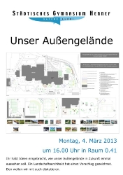 Am Montag, dem 04.03.13, fand am Städtischen Gymnasium Hennef der Planungsworkshop zur Gestaltung des Außengeländes statt. Dieser wurde von der Bürogemeinschaft Haus Sülz organisiert und von etwa 25 Leuten besucht. Die Architekten hatten sich mit den bei einem vorherigen Workshop geäußerten Vorschlägen der Schüler zur Nutzung der freien Flächen auseinander gesetzt. Des Weiteren waren bei der Veranstaltung unter anderem das Umweltamt und der Schulverwaltungsrat der Stadt Hennef, Schülersprecher Benjamin Degen und Schulleiter Martin Roth anwesend. Nach der Begrüßung durch Herrn Roth präsentierte Frau Hegemann stellvertretend für das Haus Sülz die erarbeiteten Ideen: