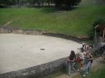 Als wir dann alle mal durch diese Gänge gelaufen waren, begaben wir uns auf den Weg zu unserer letzten Station: dem Amphitheater. Auch dort gab es einen unterirdischen Gang, den wir alle zusammen gelaufen sind. Es gab dort unten zwei Brunnen. In dem einen schwamm etwas, was ein Teil der Gruppe für ein Auge hielt. Frau Meyer-Eppler holte es raus und wir „sezierten“ das „Auge“. Es stellte sich aber raus, dass es nur eine Kastanie war. Nach dem wir uns von diesem kleinen Schock erholt hatten, besichtigten wir noch die Räume, in denen wilde Tiere gehalten und sowas wie Heu oder so gelagert wurde/-n.