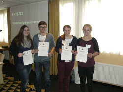 Nachdem Jana Kraheck, Monika Kloss, Fabian Kotterba und Franziska Scheeben aus der Q2 im Februar das Landesfinale des Mathematik-Wettbewerbs Alympiade gewonnen hatten, durften sie im März in Begleitung ihrer Mathematik-lehrerin Senta Haas zum internationalen Finale in das niederländische Garderen fahren. Dort trafen sie auf acht Teams aus den Niederlanden, ein weiteres deutsches Team sowie sechs Teams aus Dänemark, dem Iran und den Niederländischen Antillen und mussten an zwei Tagen eine weitere praxisorientierte Aufgabe bearbeiten. Während es im deutschen Finale noch um die Optimierung eines Flugzeug-Boardings ging, mussten sie nun einen Paketlieferservice für ein fiktives Land nach bestimmten Kriterien analysieren und dann mittels eines Simulationsprogramms am Computer optimieren.