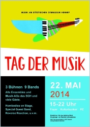 Der Musikbereich des SGH präsentiert in diesem Jahr zum ersten Mal den "Tag der Musik". Auf drei verschiedenen Bühnen wird am 22. Mai 2014 zwischen 15.00 und 22.00 Uhr ein vielfältiges Programm von Akustik-Pop bis Vocal-Folk, von Jazz bis Klassik und von Orchester zum Singer-Songwriter-Duo geboten. Es treten Ensembles des Gymnasiums neben weiteren professionellen lokalen Bands auf.