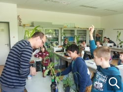 Sehr anschaulich und mit viel Enthusiasmus zeigte Dr. Robert Koller unseren Schülerinnen und Schülern, warum für uns Menschen Pflanzen unersetzlich für das Überleben sind. Nicht nur Bekanntes aus dem Biologieunterricht (z.B.: Pflanzen produzieren den für uns lebenswichtigen Sauerstoff) wurde thematisiert, sondern auch die intensive Nutzung von Pflanzen von der Kleidung über Nahrungsmittel bis zur Nutzung als Energiequelle. Aber welche Pflanze wird wie genutzt? Dazu sollten die Schülerinnen und Schüler aus einer Auswahl von Pflanzensamen, Pflanzen und daraus entstandene Produkten die richtigen Kombinationen zuordnen. Gar nicht so einfach! Wie sieht denn eigentlich eine junge Reispflanze, eine junge Zuckerrübenpflanze oder gar deren Samen aus? Durch den Besuch wurde deutlich, dass unser Leben ohne Pflanzen nicht möglich wäre und es sich lohnt, sich Gedanken über eine effektivere Nutzung zu machen. Daran forscht das Forschungszentrum Jülich.