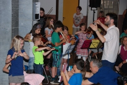 Im Anschluss an das Kennenlernfest für unsere zukünftigen 5er und parallel zum Treffen des Abi-Jahrgangs 2005 sollte erstmals ein musikalisches Großprogramm am SGH unter freiem Himmel stattfinden. Auch wenn das SGH Open Air aufgrund der Unwetterwarnung für den Rhein-Sieg-Kreis dann doch kurzerhand in das Gebäude verlegt wurde, tat dieser Umstand der Stimmung bei Publikum und MusikerInnen keinen Abbruch. Und so prasselte draußen der Starkregen herab, während im Inneren das Orchester der Con brio Klasse 5d mit „Ein Hoch auf uns“ ebenfalls stark begann. Anschließend zeigten die SchülerInnen der Con brio Klasse 6d als Abschlussprogramm nach zwei Jahren gemeinsamer Orchesterzeit eine bunte Palette von Songs. Europäisch und schulverbindend wurde es, als gemeinsam mit den Con brio Klassen Instrumentalisten aus der Grundschule Hanftalschule die sogenannte „Eurovisions-Hymne“ (das Prélude aus dem Te Deum von Charpentier) intonierten.