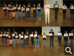 Am 24. September erhielten die stolzen Prüfungsteilnehmer also ihre Zertifikate der Uni Cambridge. Für den unterhaltsamen Rahmen sorgte die con brio-Klasse 6d, die auch Ms. Anne Grundy vom Englischen Institut in Köln unterstützten: Frau Grundy, die im Namen der Universität Cambridge die Zertifikate überreichte, demonstrierte dem Publikum, in wie vielen Ländern sich unsere Flyers - nun sozusagen amtlich - auf Englisch unterhalten können. So hielten die Sechstklässler also die Flaggen all dieser Länder hoch. Umgedreht ergab sich aus den Flaggen mit den Anfangsbuchstaben der Länder ein herzliches „Congratulations“. Dem schließen wir uns an: Glückwunsch!