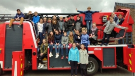 Im Anschluss haben wir uns die Fahrzeuge angeschaut und durften in einem Feuerwehrauto sitzen. Da wir uns auch mit dem Löschen von Bränden beschäftigt haben, konnten wir an einem echten Feuer das Löschen mit einem Feuerlöscher üben. Danach sind wir mit dem Leiterwagen in luftige Höhen gefahren. Der Leiterwagen kann bis auf 30m ausgefahren werden. An schönen Tagen kann man bis nach Köln schauen. Danach ging es wieder zurück zur Schule.