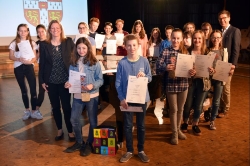 Zugegeben, unsere Flyers des Jahres 2016 mussten eine Weile warten. Am 31. März 2017 war es dann aber soweit: Die Teilnehmer am Young Learners Sprachtest der Universität Cambridge erhielten ihre Zertifikate aus den Händen von Jenny Langrish. Am Ende des vergangenen Schuljahres hatten die 18 Schülerinnen und Schüler aus den damaligen Klassen 6c und 6d an dem Sprachtest teilgenommen. Auf dem Level "Flyers" maßen sie sich in Hörverstehen, Lesen und Schreiben sowie im Sprechen mit tausenden anderen Englischlernenden auf der ganzen Welt.