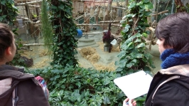 Zusammen mit einem vom Zoo gestellten Betreuer wurden uns zunächst die jeweiligen Primaten vorgestellt. Ob Vari, Kapuzineraffe, Löwenäffchen, Brüllaffe, Kleideraffe, Mantelpavian, Orang-Utan oder Bonobo – an unserem interessierten Beobachtungsdrang kam keiner dieser Arten vorbei! Im Anschluss zu der kleinen Einführung ging es für uns praktisch ans Werk. Wir untersuchten intensiv und mit Geduld die jeweiligen Primatenarten zunächst hinsichtlich der Kopfform und der Sinnesorgane: Seitliche oder frontale Augenlage, feuchte oder trockene Nasenregion, bewegliches Ohr oder unbewegliche Ohrmuschel? Wo liegt der Schwerpunkt mit Blick auf die Sinnesleistung – Sehen, Hören oder doch Riechen? All diese Fragen stellten wir uns, sodass wir nach deren Beantwortung in der Lage waren erste Verzweigungsmöglichkeiten hinsichtlich des Stammbaums festzulegen. So teilten wir die Primatenarten den Gruppen Schmalnasenaffen – zu der wir Menschen übrigens auch gehören – und Breitnasenaffen zu.
