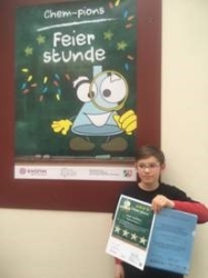 Am Freitag den 16.3.2018 bin ich mit meiner Oma und meiner Mutter zur Preisverleihung nach Marl gefahren. Sie fand in einem Saal des Informationszentrums im Chemiepark statt. Gemeinsam mit 38 anderen Jungen und Mädchen, die ebenfalls eine 4-Sterne-Wertung erreicht hatten, erhielt ich eine Urkunde und eine tolle Chem-pions Tasse mit Power-Bank und Süßigkeiten. Riesig gefreut habe ich mich über meinen Sonderpreis: Einen Tag mit Führung im Chemiepark Marl. Cool war auch die Zaubershow mit Experimenten während der Veranstaltung. Nach der Preisverleihung gab es noch einen Imbiss, bevor sich alle wieder auf den Heimweg machten.