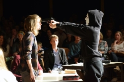 Unter die Haut ging vor allem der zweite Teil des Stückes, in dem die Zuschauer ganz nah dran sind an den Entwicklungen in dem Mikro-Kosmos Klassenzimmer. Nach und nach müssen sich Schülerinnen und Schüler den Proben stellen, die ihnen der Amokläufer unter vorgehaltener Waffe auferlegt. Die maskierte Person nötigt seine Opfer, das Innerste nach außen zu kehren und entblößt so die Fassaden der Charaktere als Betrug und Selbstbetrug. Dass dies überzeugend gelingt, ist nicht nur der dramaturgischen Aufarbeitung zu verdanken, sondern vor allem den ausnahmslos tollen darstellerischen Leistungen des gesamten Ensembles.