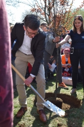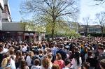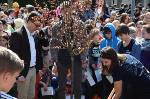 Die SV hatte sich für den Donnerstag aber schon mächtig was einfallen lassen: In der siebten Stunde strömten die Schülerinnen und Schüler aus den Räumen ins Freie und sangen dabei ein eigens auf Herrn Roth komponiertes Lied. Leonie Thunhorst und Torge Kruse hielten die Ansprachen, überreichten Herrn Roth ein Foto von der Schülerschaft in der Formation unseres Logos und geleiteten ihn zu der Stelle, an der zukünftig eines seiner Vermächtnisse wachsen und gedeihen wird: Mit tatkräftiger Unterstützung durch die SV pflanzte der scheidende Schulleiter einen jungen Baum, eine Blutpflaume.