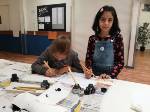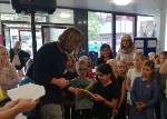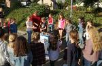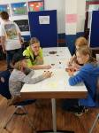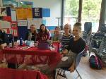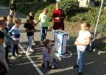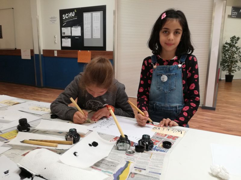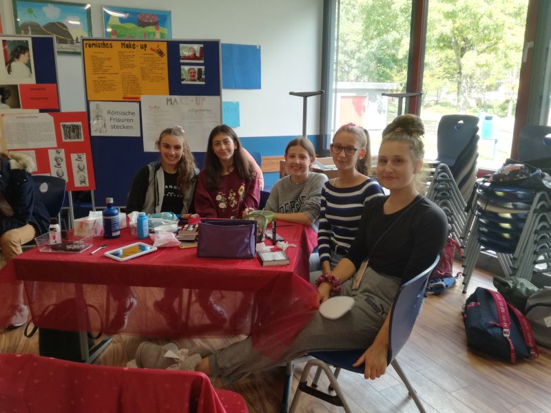Römisches Gefühl erlebten v.a. die Mädchen an der Friesierstation, wo sie zwar nicht von eigenen Frisier-Sklavinnen, aber von freundlichen Schülerinnen aus dem Jahrgang 9 kunstgerecht frisiert und geschminkt wurden. Schreiben mit dem Schilfrohr und Spielen mit Kastanien ließen ebenfalls die römische Alltagswelt erfahren. Auf der Suche nach der Bedeutung bekannter römischer Sprichwörter zogen die Kinder durch den gesamten Raum, wo sie an den Wänden hilfreiche Vokabeltipps finden konnten. Fortuna war den drei glücklichen Gewinnern wohl hold, als ihre Lösungen aus dem Topf gezogen wurden.