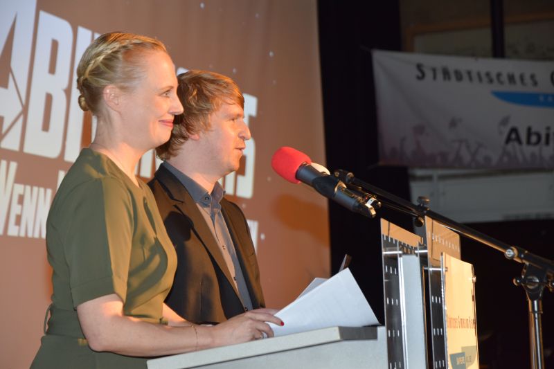 In der Aula der Gesamtschule Hennef West empfing die frischgebackene Abiturientia die Gratulationen durch den Bürgermeister Mario Dahm, unsere Schulleiterin Trixi Glaser sowie durch die Vertreter der Elternschaft, Christian Schwindt und Uli Birkmann, die musikalisch daran erinnerten, wie aufreibend so eine Schullaufbahn sein kann – nämlich „Atemlos durch G8“. Glückwünsche gab es natürlich auch von Frau Dr. Teubler und Herrn Marner, also der engagierten Stufenleitung, die die Heldinnen und Helden durch die Oberstufe und durch das Abitur begleitet hat. Für den Abiturjahrgang sprach Abiturientin und Schülersprecherin Emma Collenberg und stellvertretend für die Schülerschaft richteten Ida Müskes und Sven Esser aus der 5c ein Grußwort an die Absolventen.