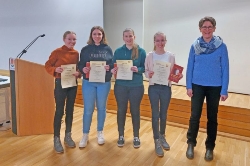 Die Arbeit der vier Mathe-Cracks war so herausragend, dass diese gemeinsam mit sieben anderen NRW-Teams im Februar an einem Auswahl- und Trainingswochende in Soest teilnehmen durften. Hier beschäftigten sie sich mit komplexeren Fragestellungen wie z.B. die Entwicklung einer Steuerformel zur Förderung nachhaltiger und zuckerarmer Ernährung. Und auch wenn das Wochenende für Lisa, Sophie, Franziska und Emma sehr anstrengend war, hat sich die Teilnahme gelohnt und freuen sie sich gemeinsam mit ihren Mathematiklehrerinnen Senta Haas und Nina Burgard über den tollen Erfolg.