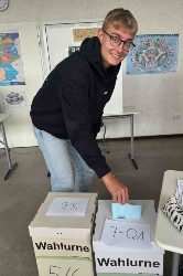Anfang Mai haben alle Schüler:innen ihre Wahlbenachrichtigung erhalten und in der Woche vom 3.6. bis zum 7.6. findet im Wahllokal 2.08 die Wahl statt. Der Raum ist so hergerichtet worden, dass er einem Wahllokal sehr gleicht: Es gibt Wahlhelfer:innen (die jeweiligen Lehrkräfte), ein Wählerverzeichnis und insgesamt fünf Wahlkabinen, in denen die Schüler:innen ihre Stimmzettel ausfüllen können.