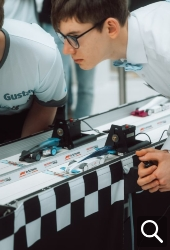 Auf einer 20 Meter langen Rennbahn müssen die mit einer Druckluftpatrone beschleunigten Rennwagen zeigen, wie schnell sie sind. Dabei geht es für die Fahrzeuge um Zehntel oder gar Hundertstel Sekunden, die mit elektronischer Zeitmessung erfasst werden.