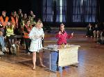 Doch auch freiwillige Beiträge verwandelte das stellenweise zu einer Kampfarena mutierte PZ in eine stille und nachdenkliche Szenarie, welche die Bedeutung dieses allerletzten Schultags für Q2 deutlich machte, die acht Jahre Freud und Leid am SGH zusammen geteilt und unvergessliche Situationen dort erlebt haben: Frau Bohlamann und Frau Ucal, welche zuvor bei dem Spiel "wer würde eher" mit dem Rücken aneinander sitzen ihre Schuhe heben und den anderen einschätzen mussten, führten jetzt in einer entsprechenden Aufmachung das Entenlied aus der Sesamstraße auf, das ihre Rolle als "Stufeneltern" unterstrich und dem Ganzen eine familiäre Note verlieh.
