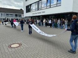 Am Donnerstag, den 12.9.2024, standen etwa 1100 Schüler des SGH und der Gesamtschule Hennef-West Hand in Hand in einer gemeinsamen Menschenkette auf dem Schulcampus, um sich gegen Rechtsextremismus einzusetzen, und zwar unter dem Motto "Schule ohne Rassismus, Schule mit Courage". Die Umsetzung dieses Projektes geschah ohne Einwirkung der Schulleitungen durch die Schülervertretungen, die gemeinsam alles planten und organisierten.