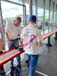 Dann erklang das Startzeichen zum Aufbau der Teamstände unter Zeitlimit. Da wir den Aufbau bereits einige Male mit Stoppuhr geübt hatten, verlief Vieles reibungslos, die in den Teamstand eingebaute Technik mit RFID und aufwändiger Schalttechnik funktionierte einwandfrei, und wieder waren wir das erste Team, das den Aufbau beenden konnte. Das feierten wir nach Toresschluss bei Audi in einem Restaurant.
